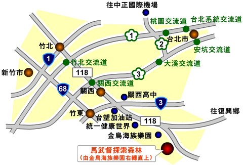 | ◎開 車 經北二高關西交流道接 118 縣道往關西方向 過台 3 省道續延 118 縣道於金鳥海族樂園旁約 37.6 Km 處右轉直上 ![]() | |||||||