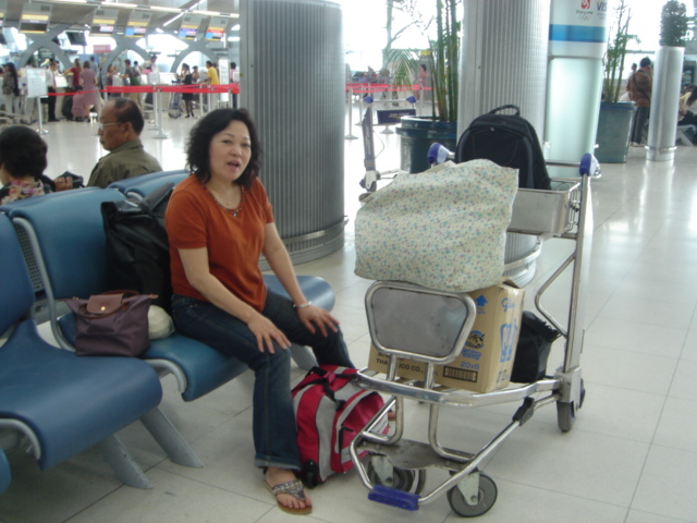 只有媽咪腳旁的紅色行李(爸媽的)以及媽咪後面那個黑色後背包(我及老爺的)